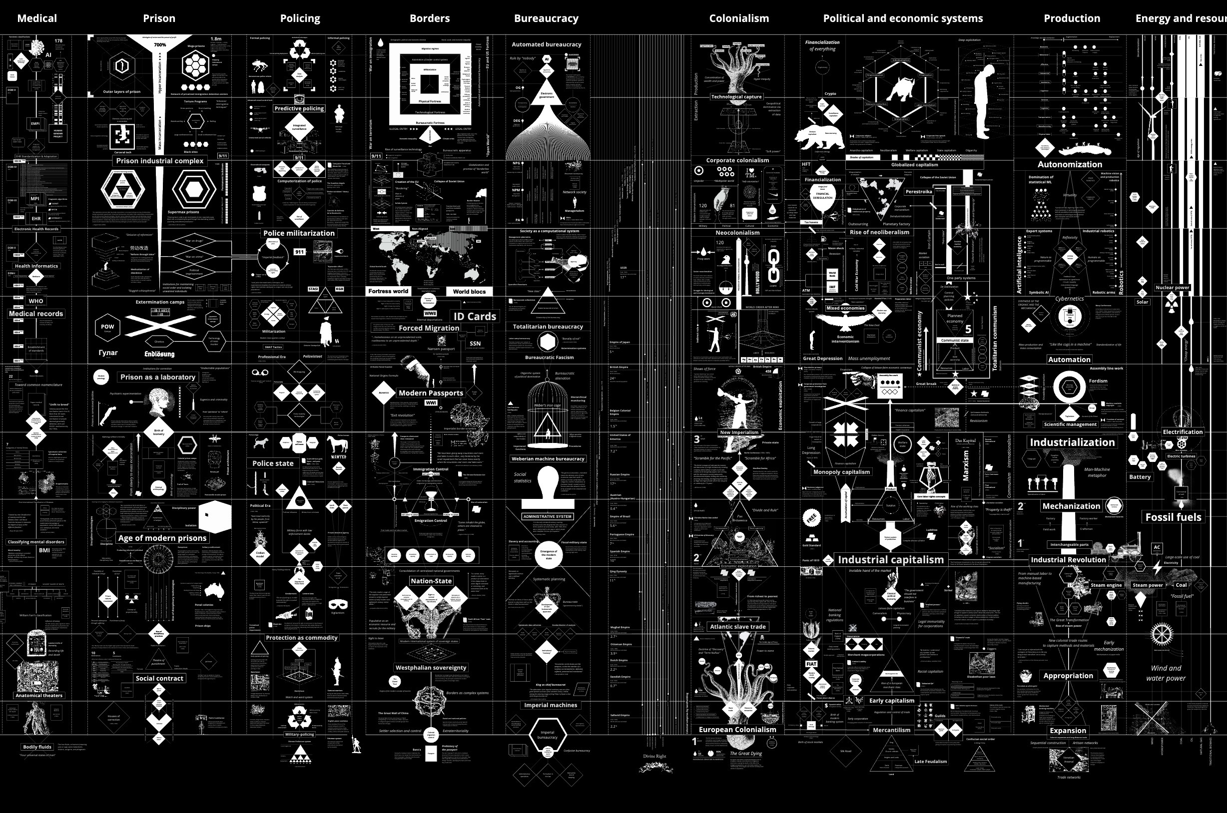 "Calculating Empires" is a large-scale visual manifesto by Kate Crawford and Vladan Joler that critically engages with the relationship between technology and power over five centuries.