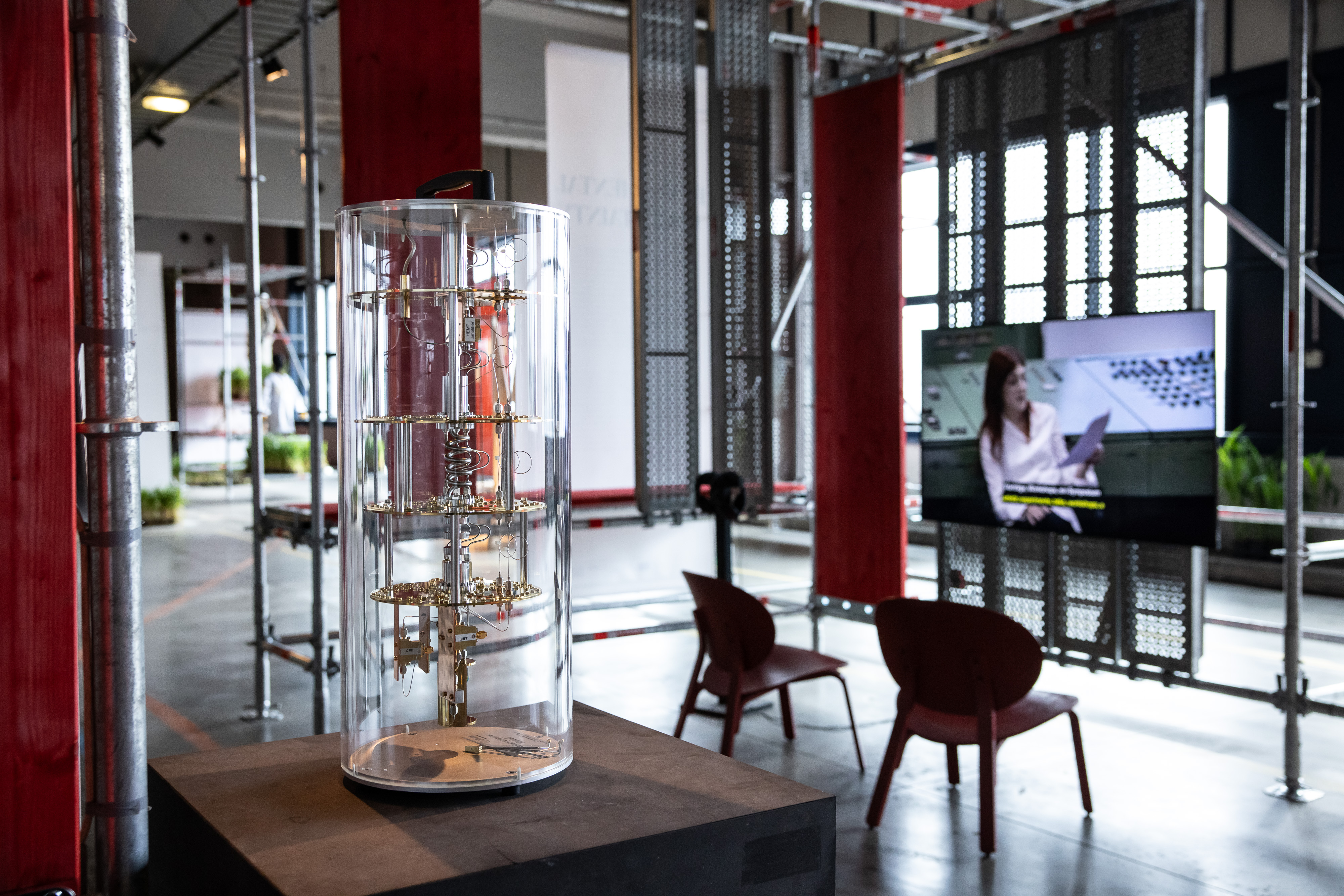 It looks like a golden chandelier—but the QC model shows the typical structure of a superconducting quantum computer. At the very bottom sits the quantum chip, which only operates reliably at temperatures close to absolute zero (-273.14°C). Here, so-called qubits process information based on the laws of quantum mechanics. To protect their delicate states, the system is extremely cooled and carefully shielded from external disturbances. Microwaves control the qubits, while precise measuring instruments analyze the signals.
