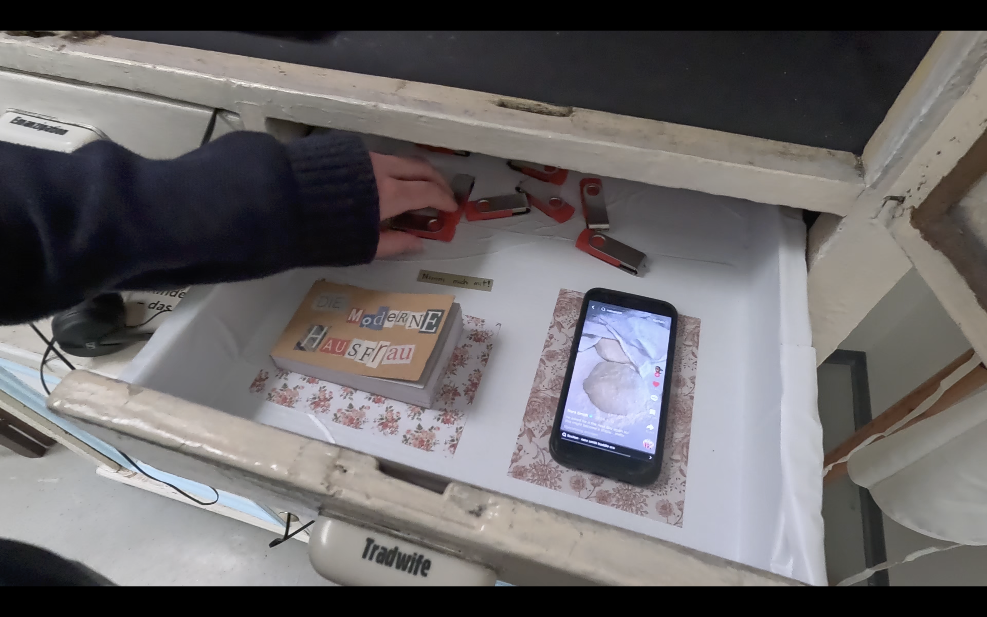 An interactive cabinet with three drawers demonstrates how the image of women and their role in society has changed over the decades. While the first drawer reveals old advertisements and stereotypes, the second documents the struggle for equality and emancipation. The third drawer showcases the modern tradwife trend on social media, which, however, seems to be undermining many of feminism's achievements.