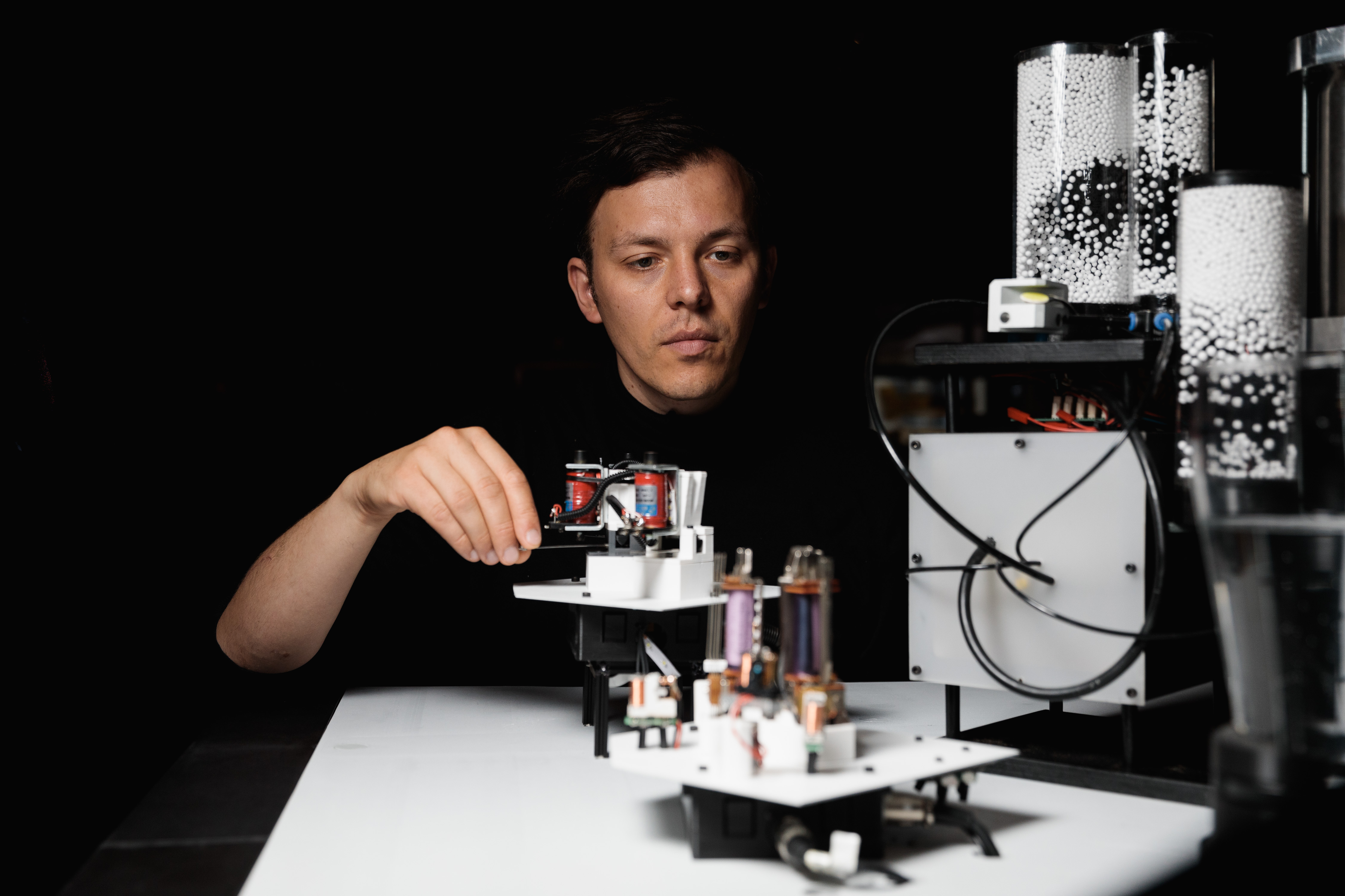A snare drum made of relays, an electronic Kalimba, a pneumatic hi-hat - "Making Techno with Music Robots" uses pretty weird musical instruments. Moritz Simon Geist is a musician, media artist and robotics engineer and builds all his instruments himself. They are all controlled via a MIDI keyboard, small piezo microphones record the sounds and play them back via an amplifier. LEDs on the instruments provide stroboscopic visuals. The result is acoustically and optically unique and more than danceable.Photo showing Moritz Simon Geist.
