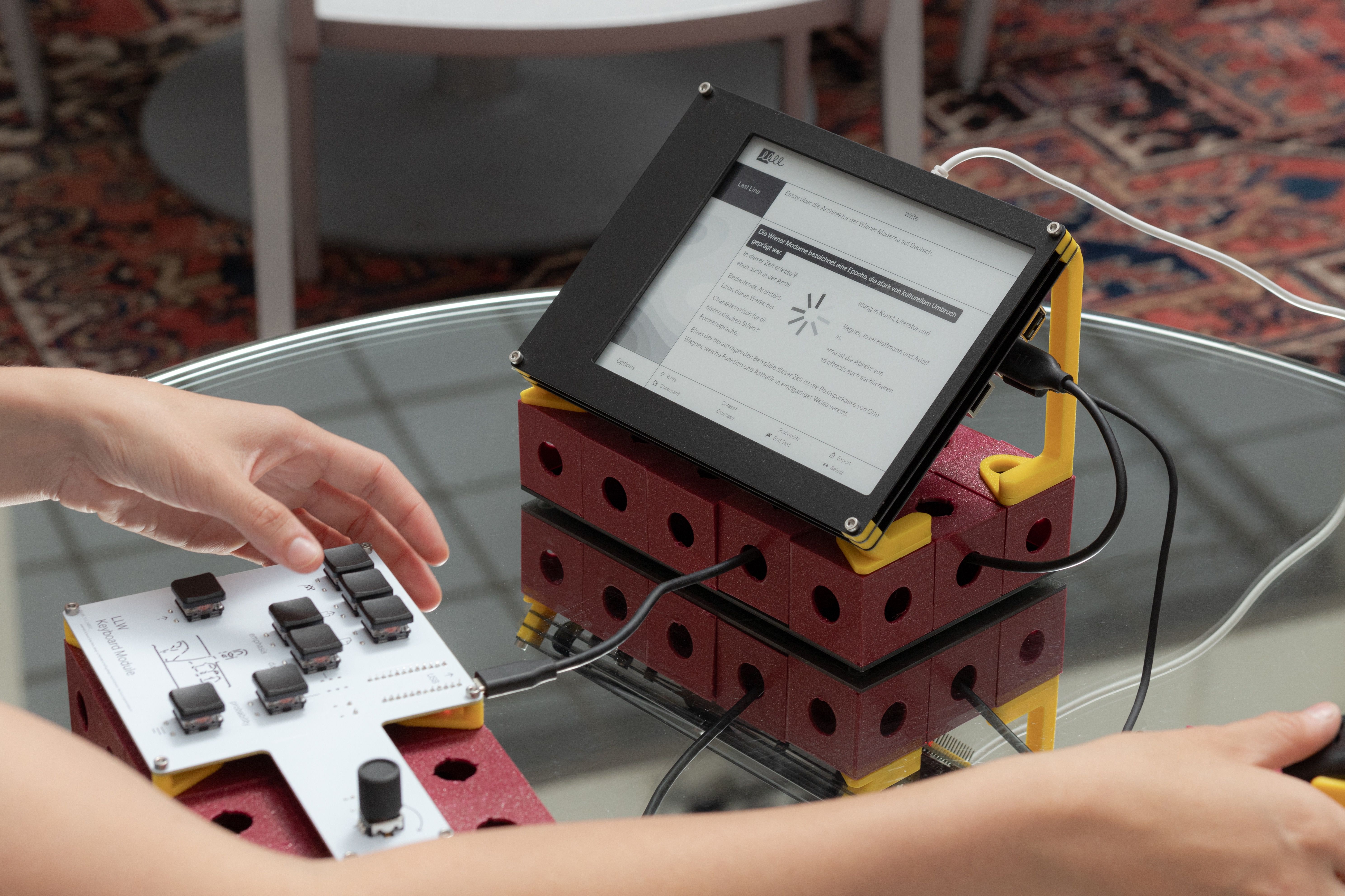 Today, technology is changing so quickly that it can be hard to follow how tools evolve and understand how they actually work. As a result, we often use complex technologies such as AI without really knowing what goes on behind the scenes. The Large Language Writer project responds to this challenge by making the process of AI text generation more open and understandable. Instead of offering a seamless and seemingly magical experience, it invites users to engage in a transparent and hands-on interaction. The system is built around three core elements: Dataset, Emphasis, and Probability. These help break down how language models like GPT (generative pre-trained transformers) create text. A custom-built machine with a voxel-based body, keyboard, e-ink screen, and camera allows users to physically explore and test this process. Through this approach, the project aims to shift our view of AI from passive use to active understanding and help uncover what is really behind the words we read.