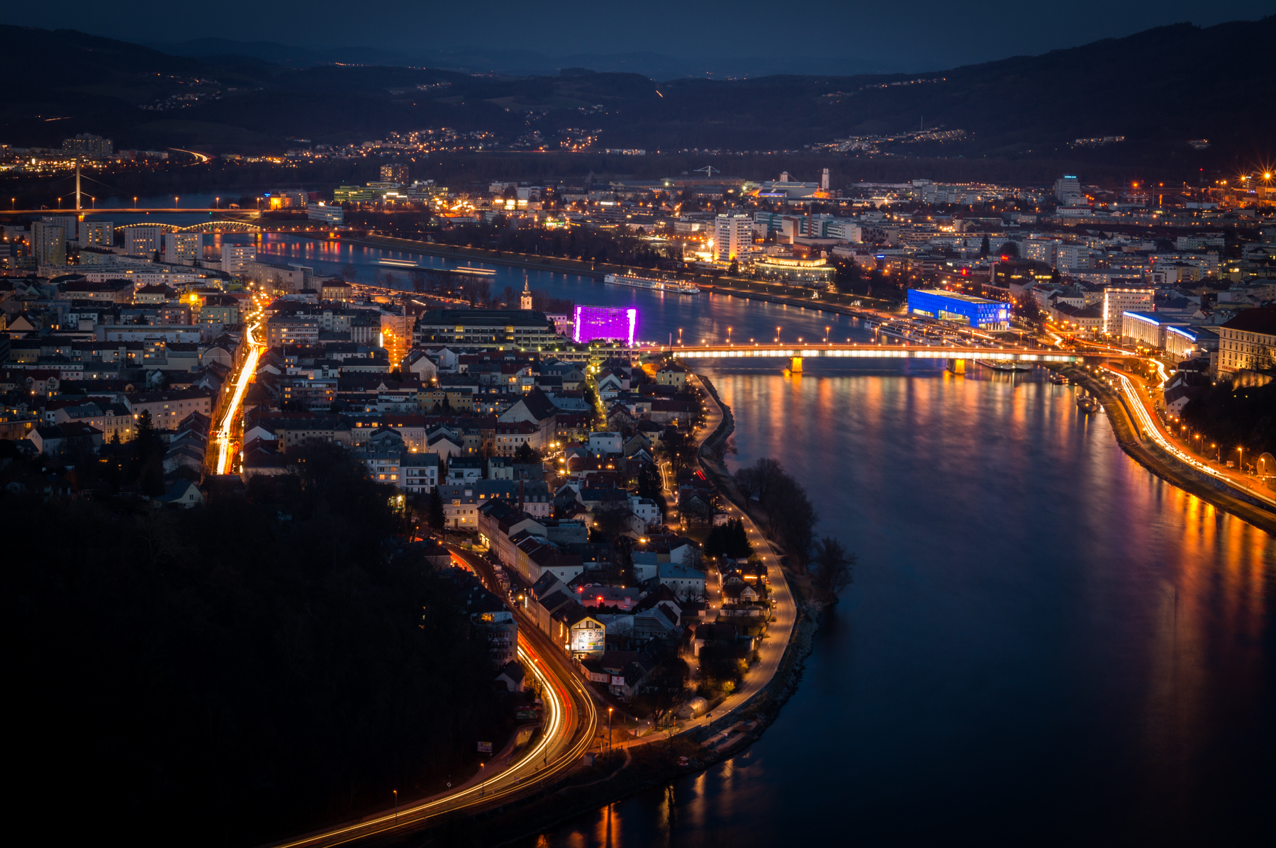 Photo showing the Ars Electronica Center (in purple) and the city lights of Linz during the blue hour.