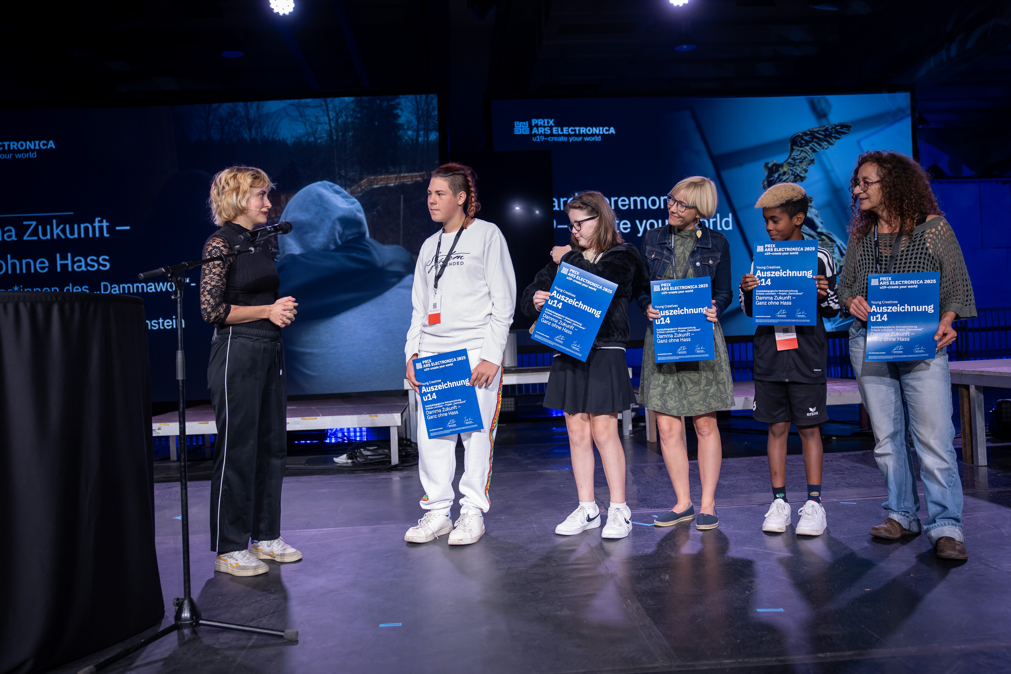 Photo showing: Vivian Bausch with u14 Award of Distinction winners/Young Creatives (Damma Zukunft – Ganz ohne Hass / Sozialpädagogische Wohneinrichtung Schloss Leonstein – Projekt „Dammawos“)