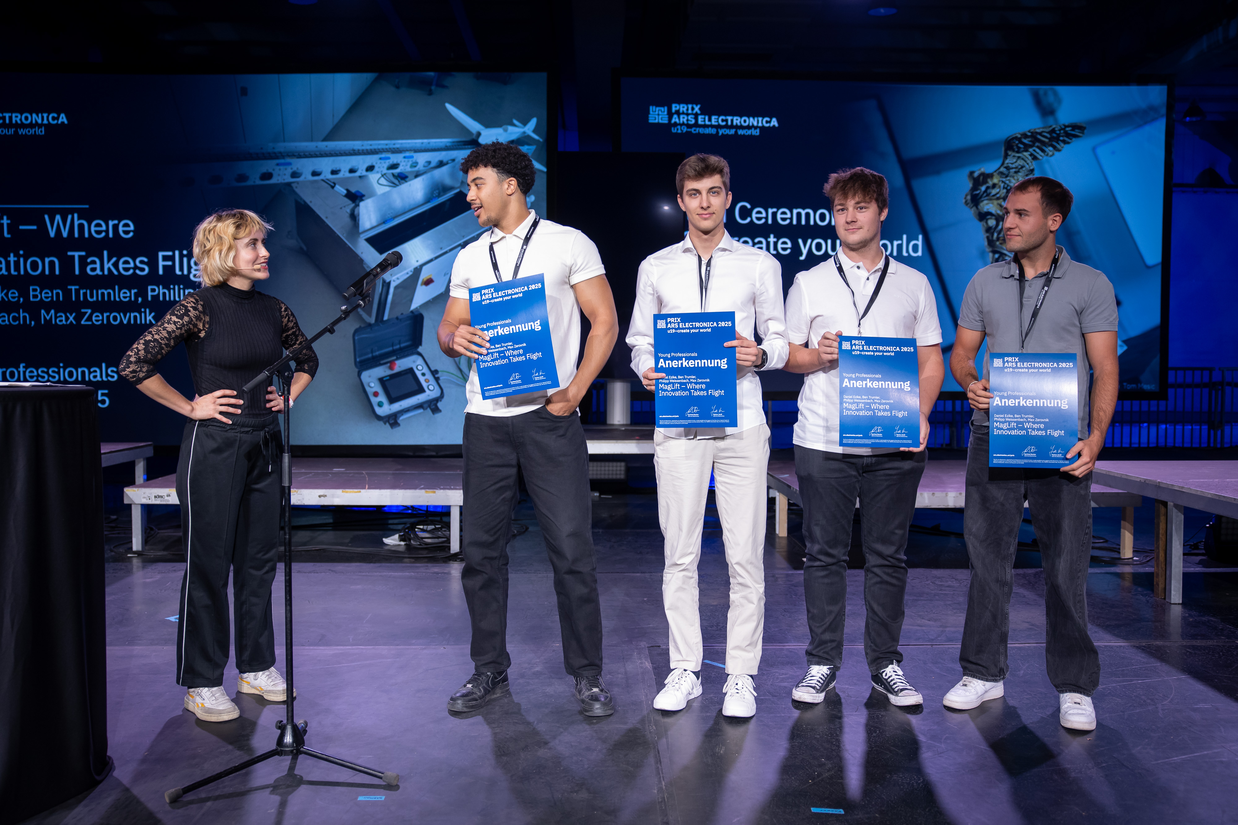 Photo showing: Vivian Bausch with Honorary Mention winners/ Young Professionals (MagLift – Where Innovation Takes Flight / Daniel Ezike, Ben Trumler, Philipp Weissenbach, Max Zerovnik)