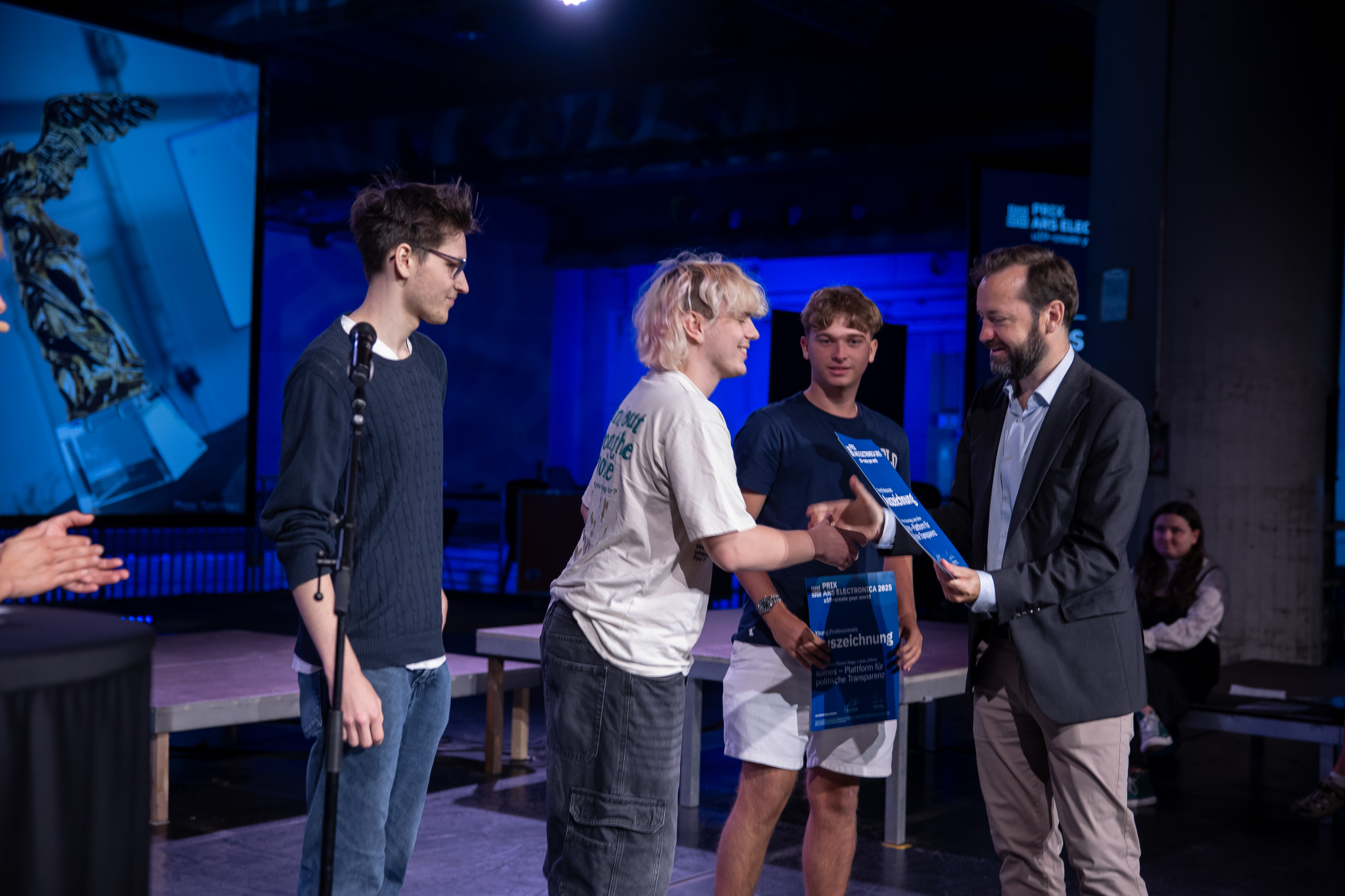 Photo showing: Vivian Bausch with Award of Distinction winners/Young Professionals (somes – Plattform für politische Transparenz, Florian Nagy, Tim Herbst, Lukas Zöhrer)