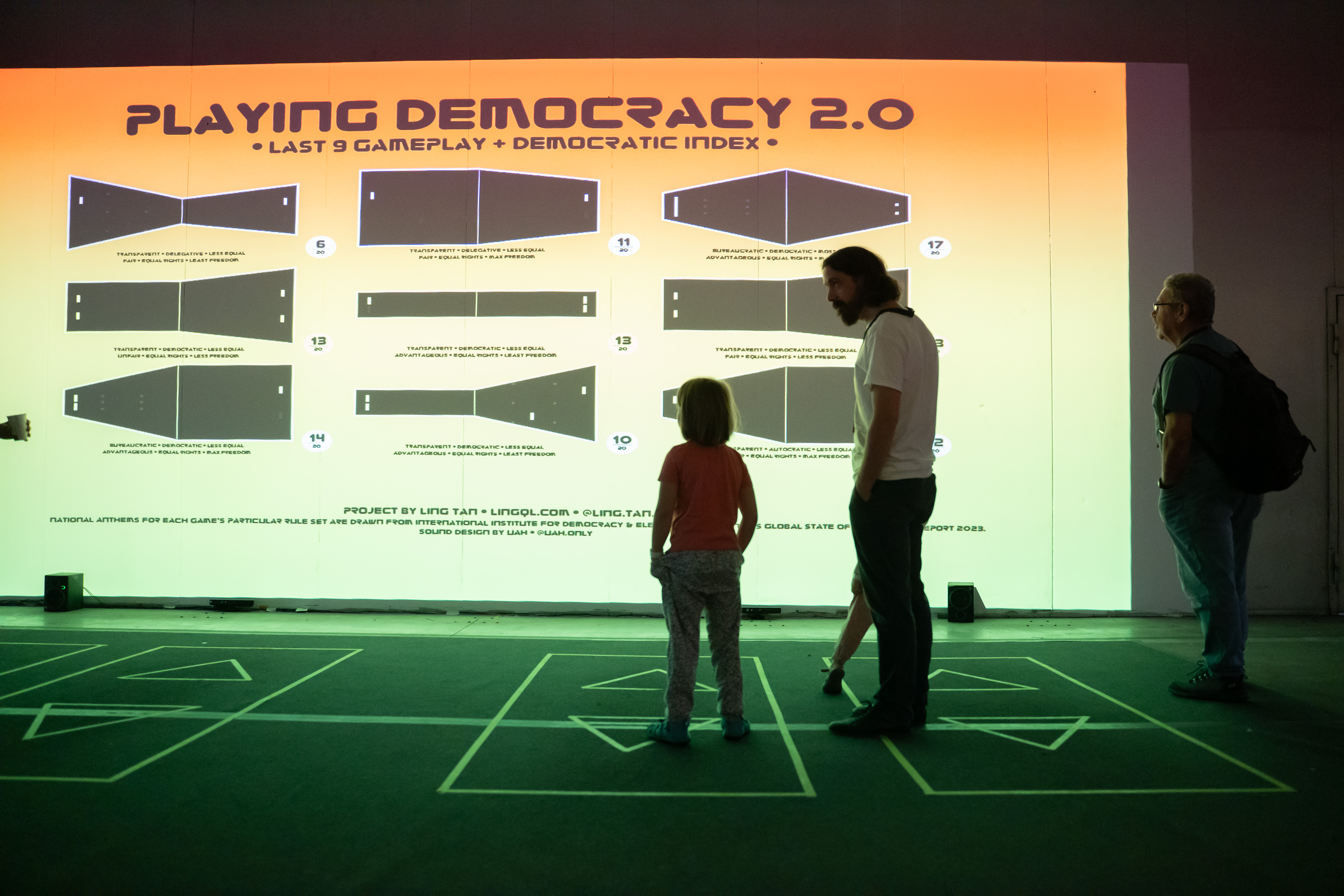 Playing Democracy 2.0 is a giant multiplayer game of Pong exploring the principles of democracy. Players rewrite the rules of the game, exploring democracy and its potential collapse. In this interactive installation, participants play through their body movements tracked by 3D cameras.