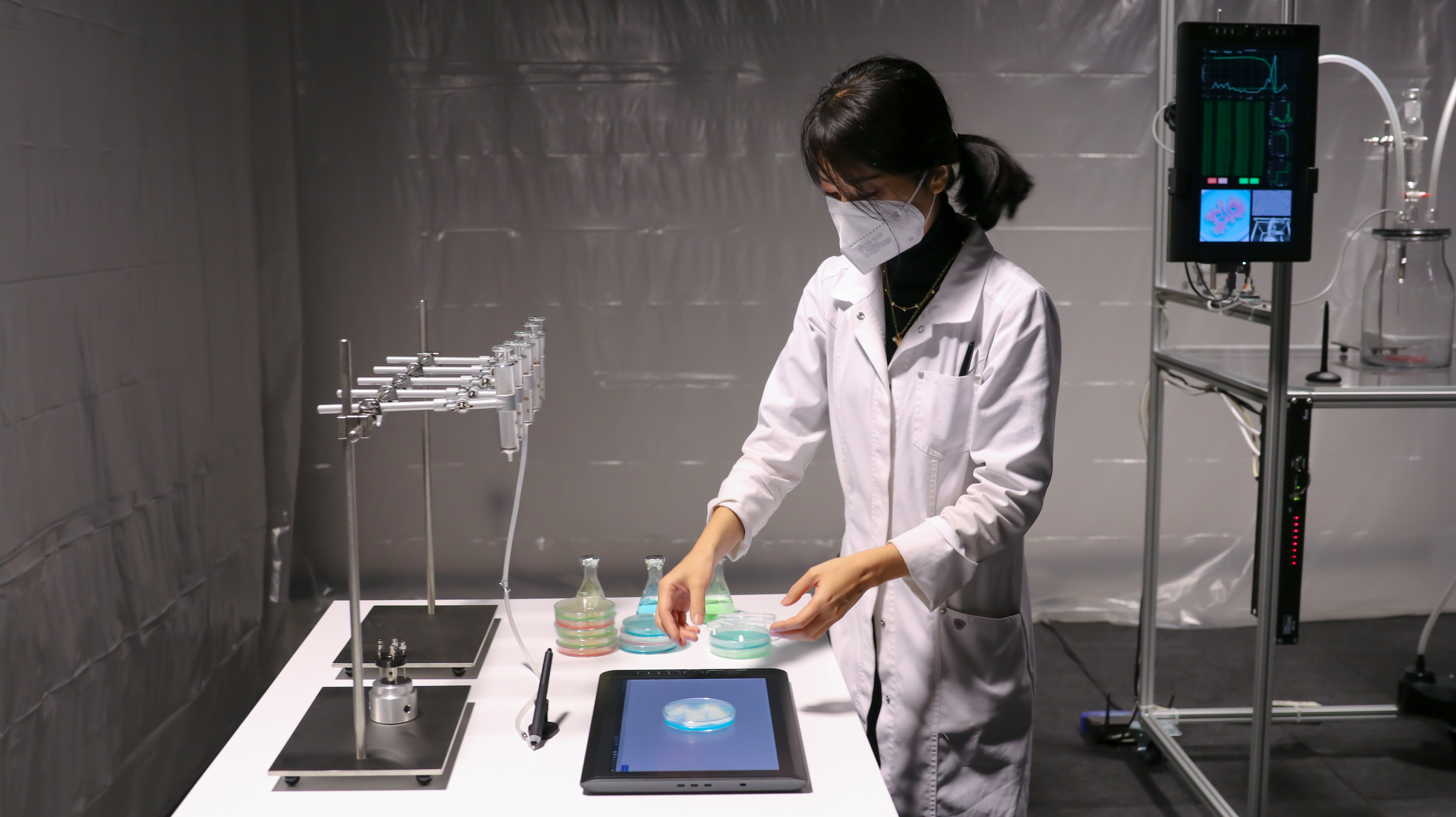 In a specially created room, Bio Ink research recently entered its second phase – at the studio of the Ars Electronica Futurelab. An experimental setup of chemical substances, test tubes and electronics serves the research team, consisting of Yoko Shimizu, Georgios Tsampounaris, Samuel Jakob Eckl, and Anastasia Bragina, as a factory of innovation. Once again, digital Wacom pens and tablets act as the starting point for the creation of Bio Ink artworks: living messages, created in a creative symbiosis between microorganisms and humans.