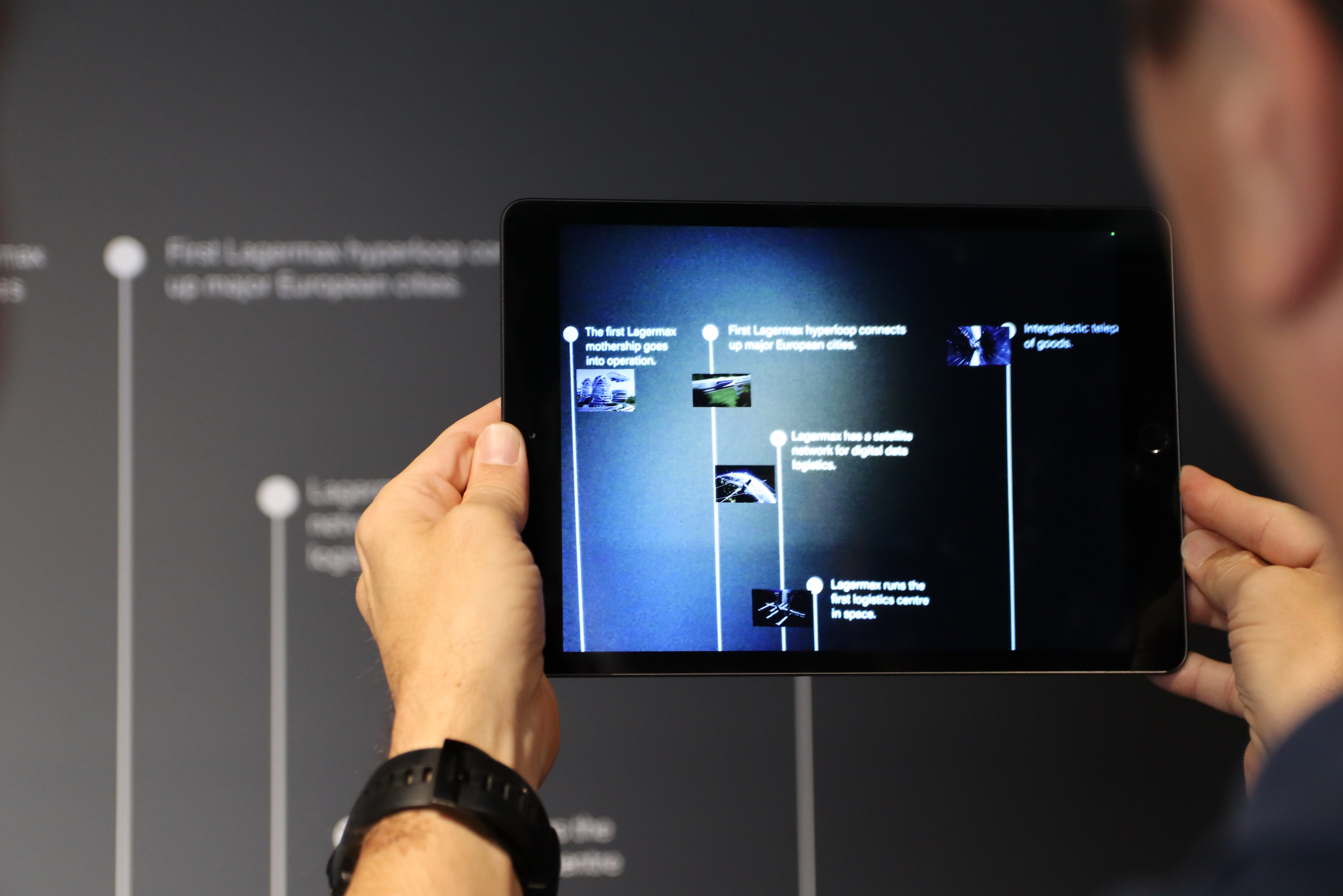 Lagermax Lagerhaus und Speditions AG presents its various business fields, visions and an impressive company history of over 100 years in a specially constructed mobile container under the slogan “Future of Logistics”. The design and implementation of this “mobile showroom” were handled by Ars Electronica Solutions, including concept development and design and exhibition layout.